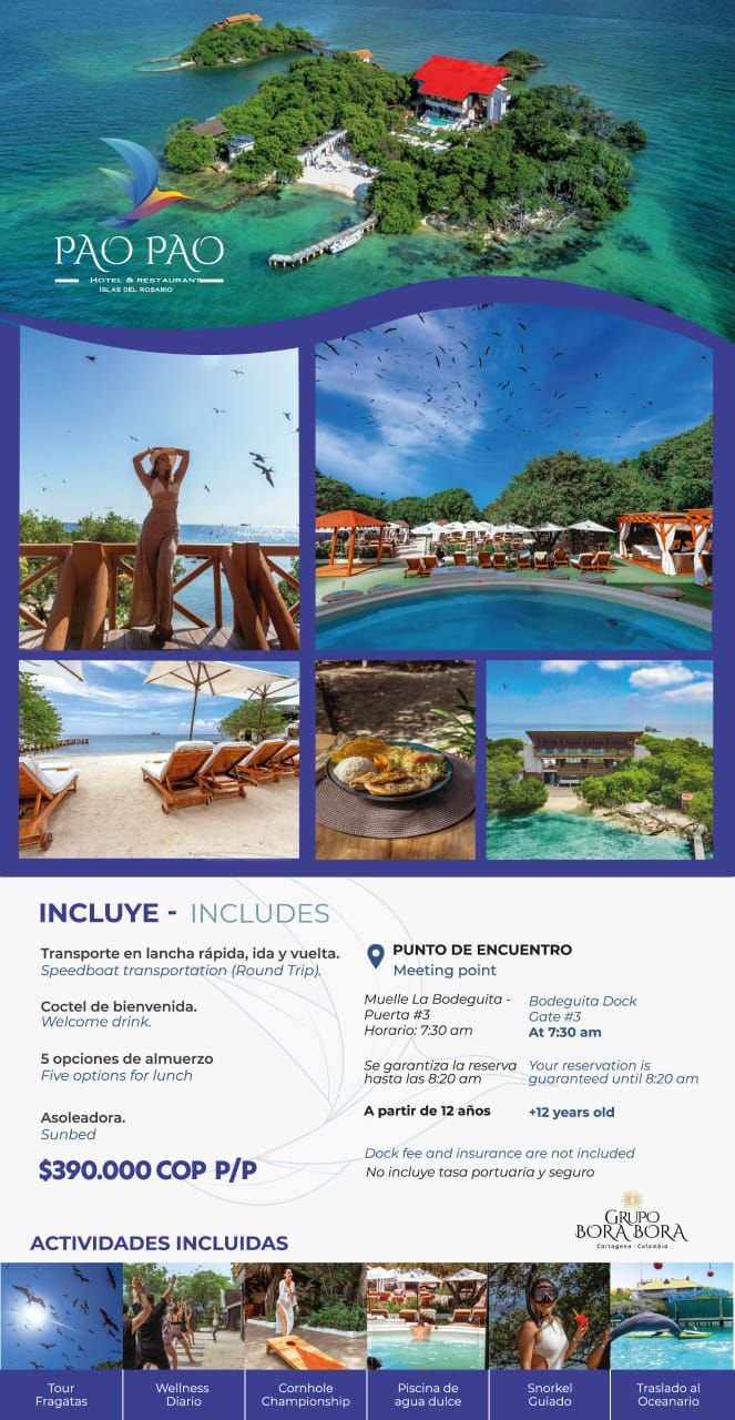 PAO PAO Beach Club, es el nuevo producto del GRUPO BORA BORA enfocado a un target adulto que busca un lugar privado para disfrutar un día de playa en un ambiente exclusivo perfecto para disfrutarlo con tu pareja o amigos. Contamos con 2 playas espectaculares, piscina de agua dulce, áreas sociales, baños impecables y una exquisita gastronomía en una atmosfera surrealista con detalles encantadores. Ritmos baleares, Chill out, Deep house, Bossa Nova acompañados de una comunidad de aves exóticas que sobrevuelan el cielo de nuestro imponente Beach Club.
